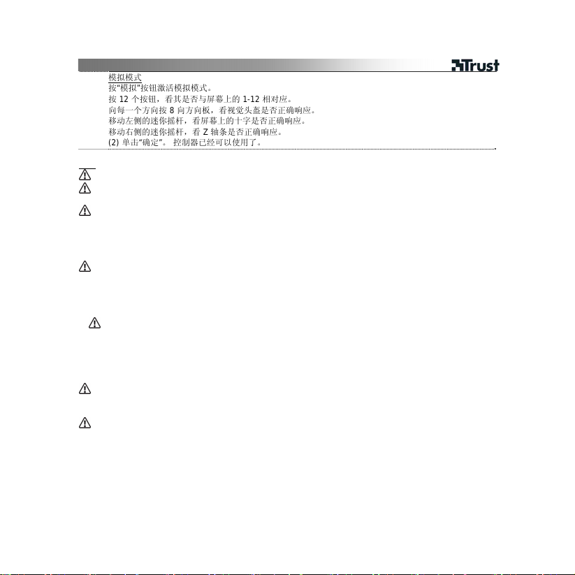 模拟模式按“模拟”按钮激活模拟模式。按 12 个按钮,看其是否与屏幕上的 1-12 相对应。向每一个方向按 8 向方向板,看视觉头盔是否正确响应。移动左侧的迷你摇杆,看屏幕上的十字是否正确响应。移动右侧的迷你摇杆,看 Z 轴条是否正确响应。(2) 单击“确定”。控制器已经可以使用了。
