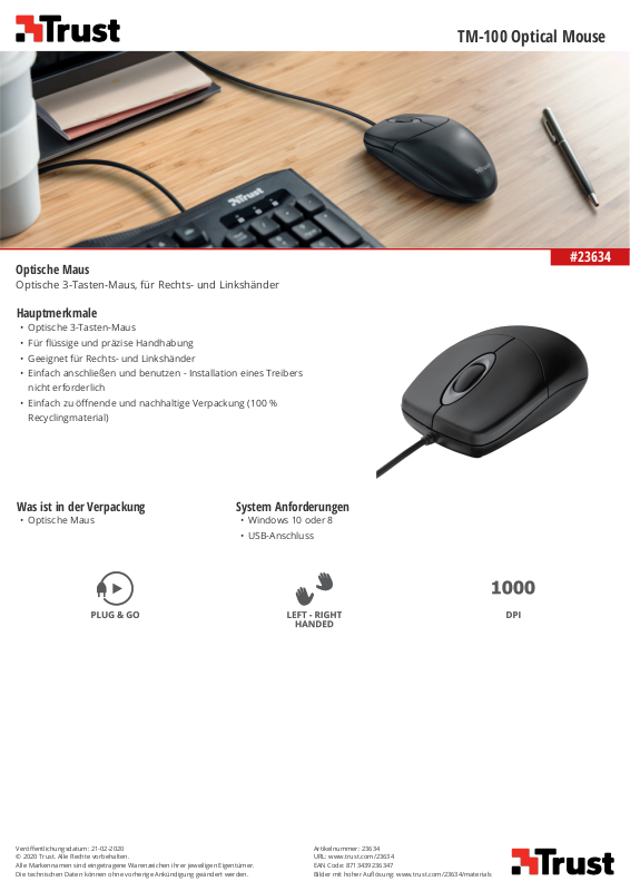 Die technischen Daten können ohne vorherige Ankündigung geändert werden. Bilder mit hoher Auflösung: www.trust.com/23634/materials