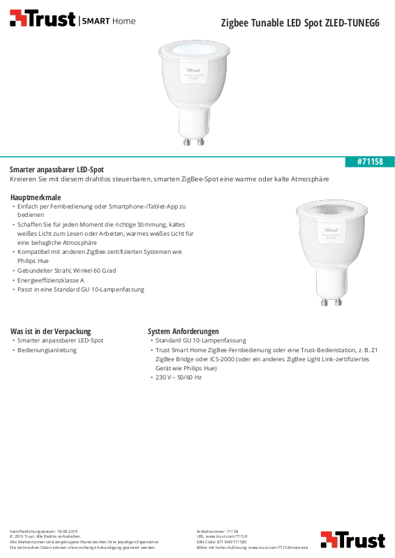 • Trust Smart Home ZigBee-Fernbedienung oder eine Trust-Bedienstation, z.B. Z1