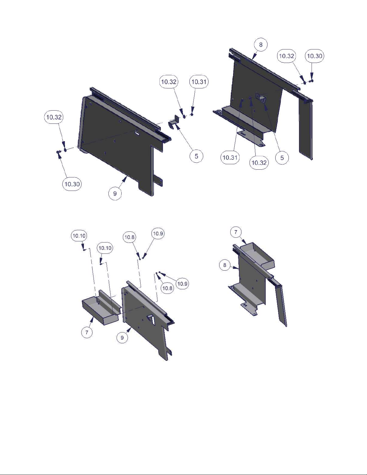 19. Fasten both the Left #9 and Right #8 Side Panels to the (2) Clamp brackets #11 using #10.16 Bolts and #10.17