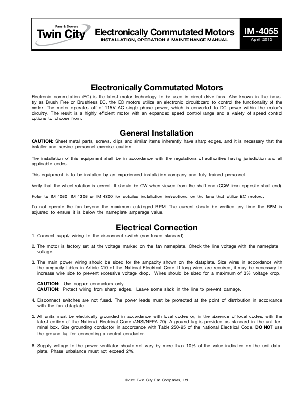 Refer to IM-4050, IM-4205 or IM-4800 for detailed installation instructions on the fans that utilize EC motors.