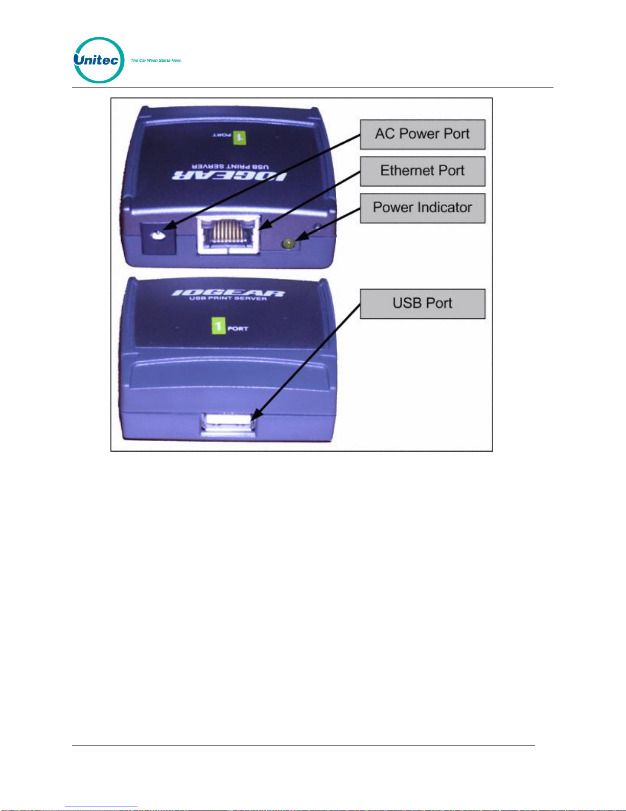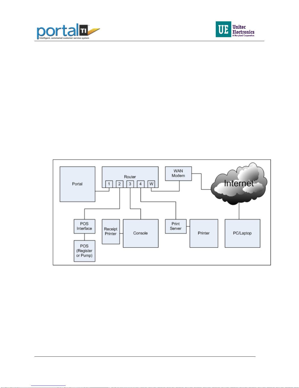 (points of sale, or POS). The Ethernet port connects to the Unitec router; the serial port