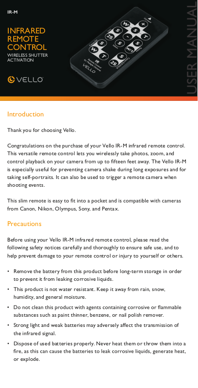 Congratulations on the purchase of your Vello IR-M infr ared remote control.