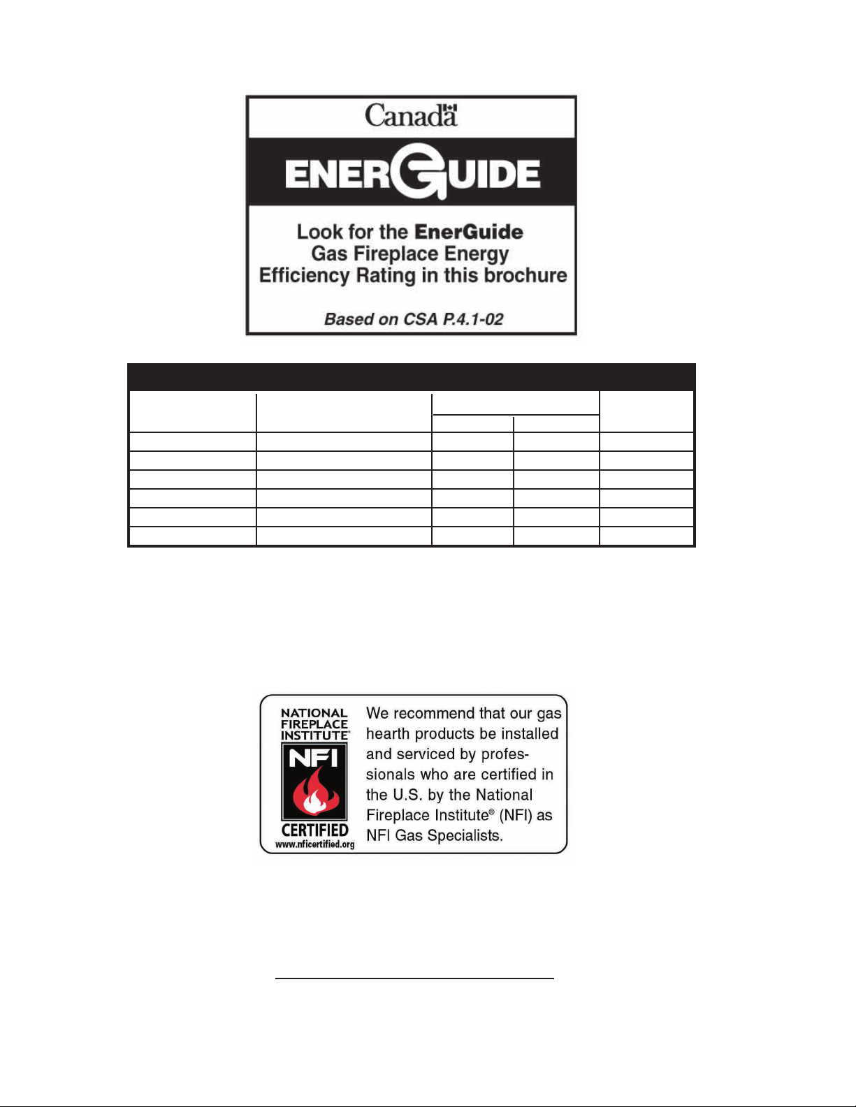 Model EnerGuide Ratings Steady State (%) D.O.E. Fireplace Efficiency (%) Fan-OFF Fan-ON (AFUE%)