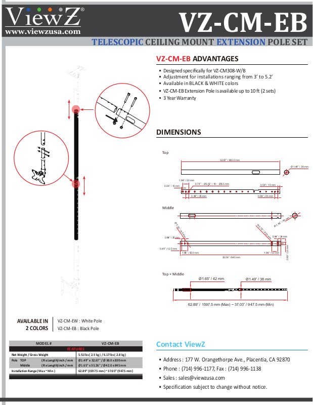 • VZ-CM-EB Extension Pole is available up to 10 (2 sets)