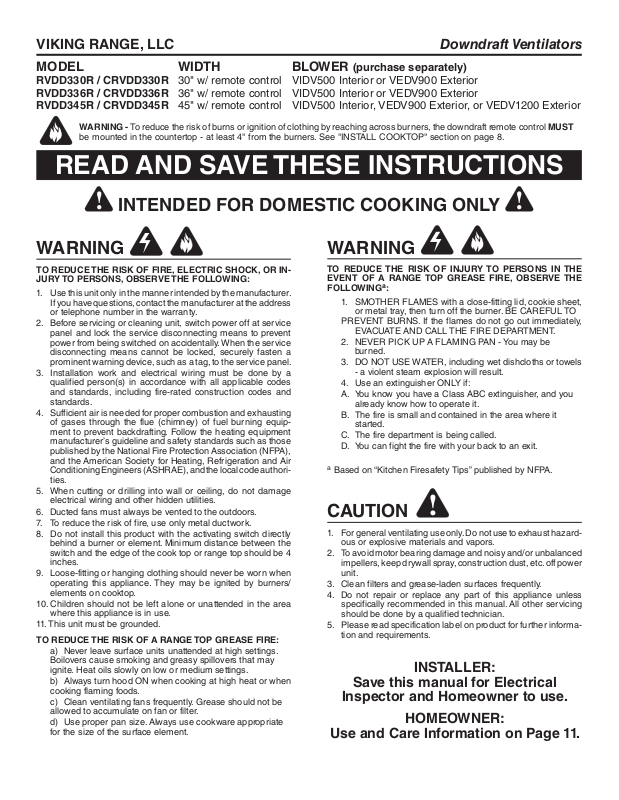 WARNING - To reduce the risk of burns or ignition of clothing by reaching across burners, the downdraft remote control MUST