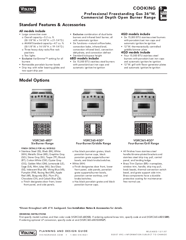 First specify model number, and then color code (VGRC365-6BDSS). If ordering optional brass trim, specify code at end (VGRC365-6BDSSBR).
