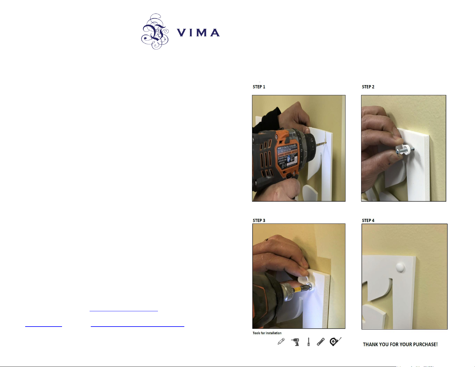 Thank you for your order. VIMA decorative panels can be broadly applied to your in and outdoor home improvement projects such as wall décor, room divider, patio fencing… Our panels are made of rigid, waterproof, fire-resistant, and mold-free PVC board which are imported from Vietnam and CNC engraved at our factory in