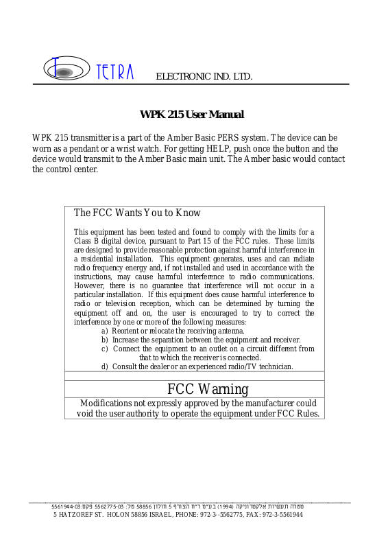 WPK 215 transmitter is a part of the Amber Basic PERS system. The device can be