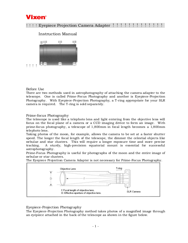 The Eyepiece Projection Camera Adapter is not necessary for Prime-Focus Photography.