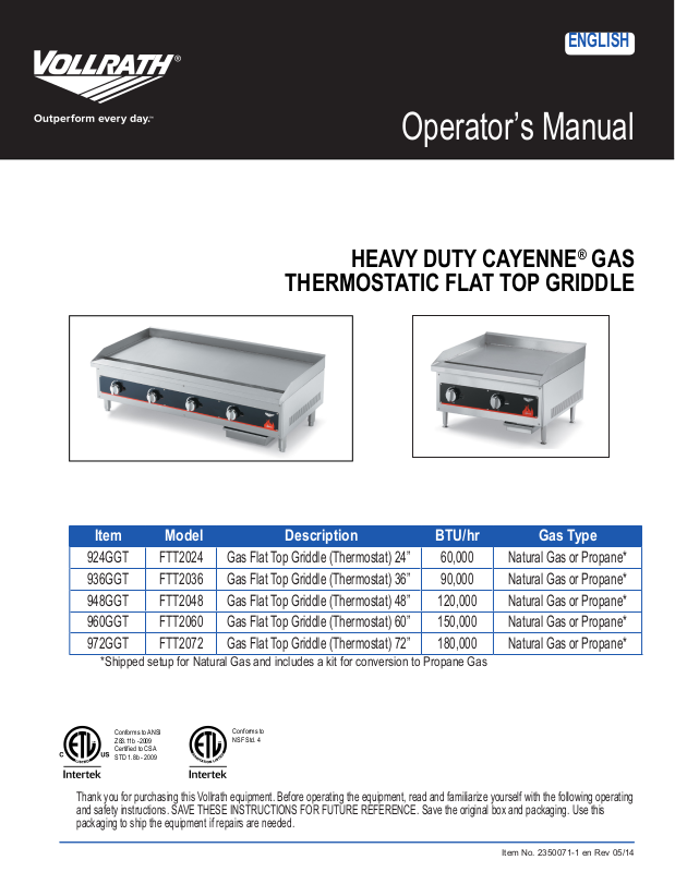 924GGTFTT2024Gas Flat Top Griddle (Thermostat) 24”60,000Natural Gas or Propane*