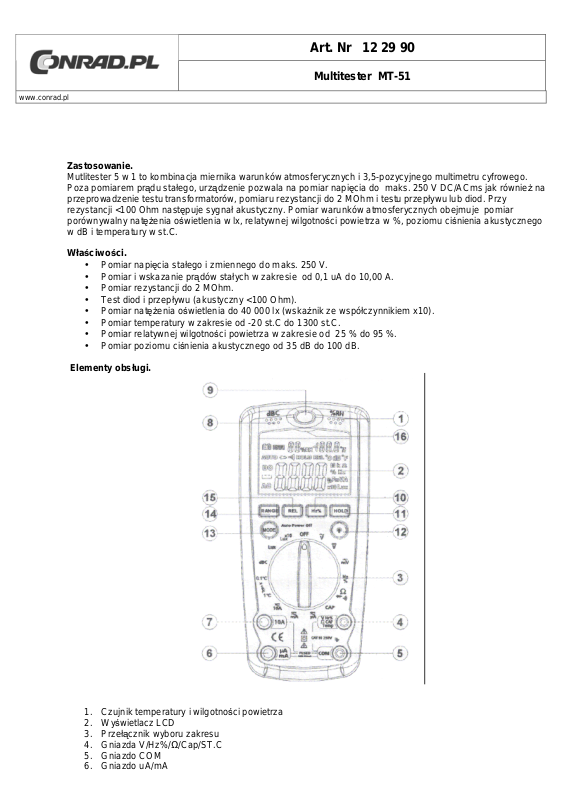 rezystancji <100 Ohm następuje sygnał akustyczny. Pomiar warunków atmosferycznych obejmuje pomiar