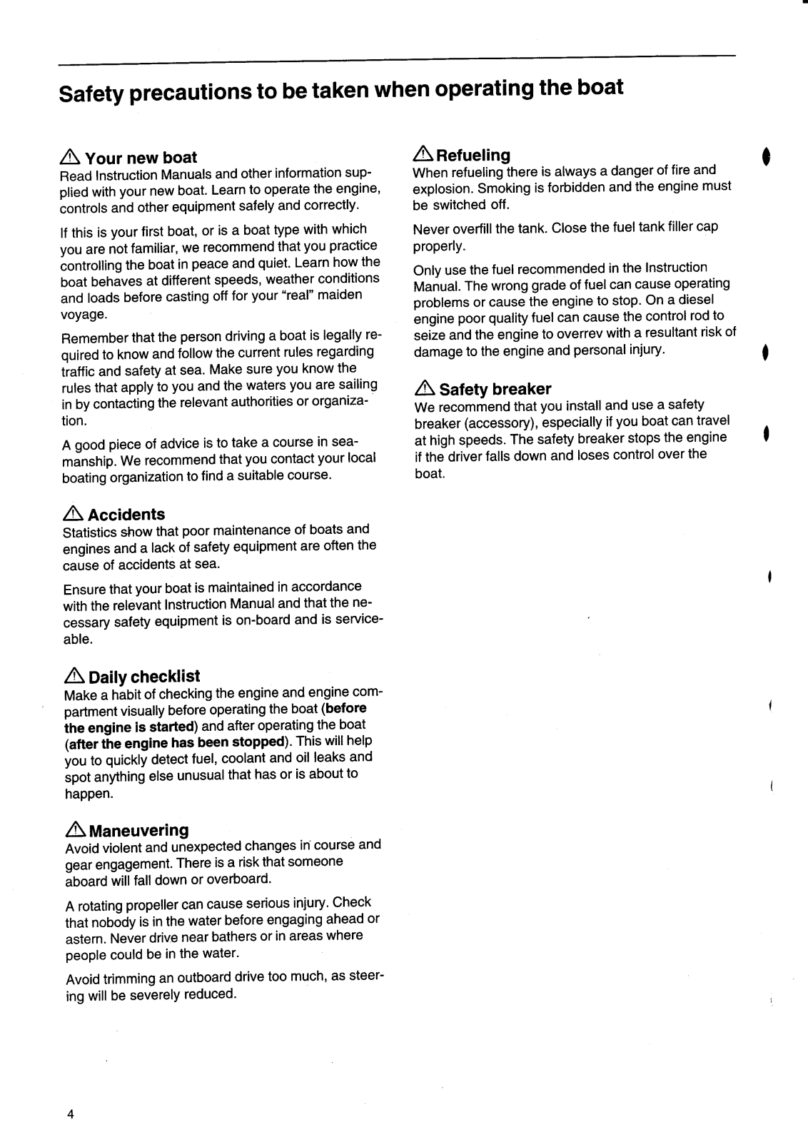 Read this chapter carefully. It concerns your safety. This section describes how safety information is presented in the Instruction Manual and on the engine. It also gives a general account of basic safety precautions to be taken when operating the boat and maintaining the engine.
