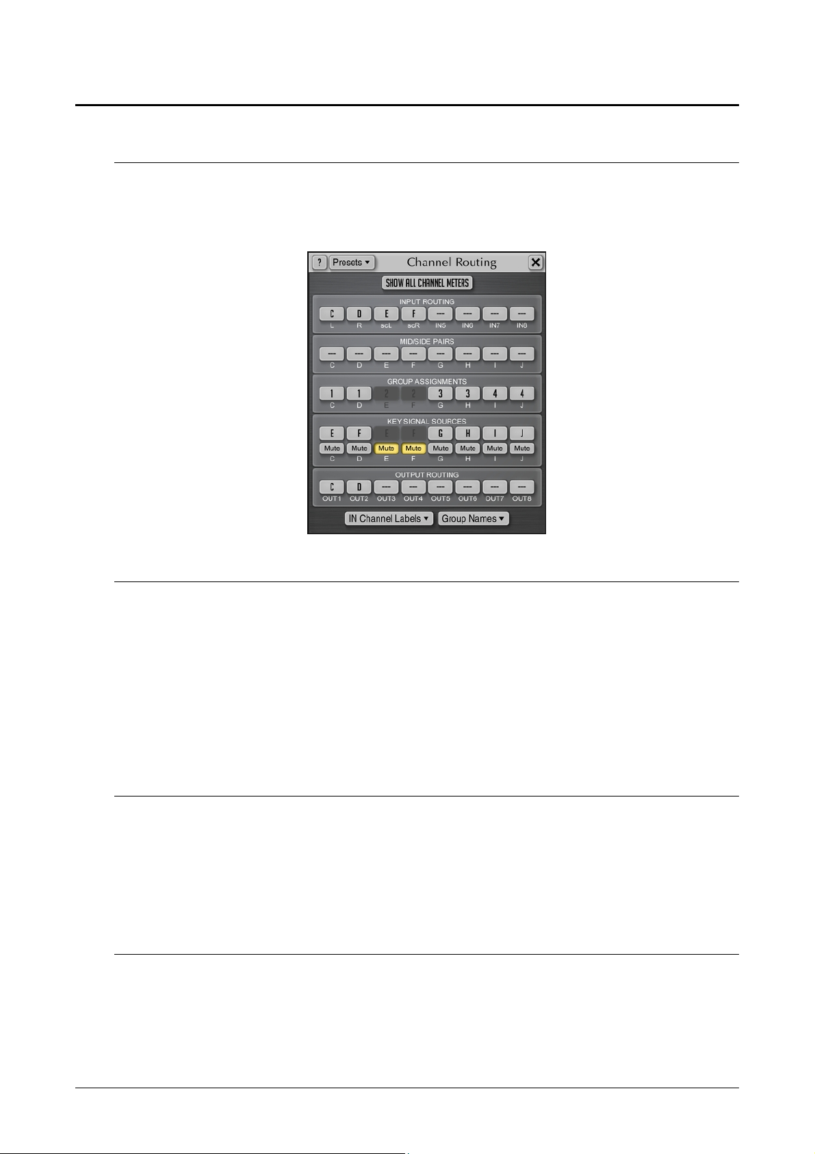 window; the quick routing preset selector “down” button; the channel group selector;
