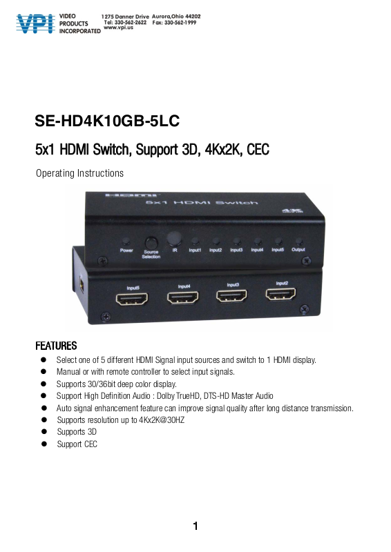 Select one of 5 different HDMI Signal input sources and switch to 1 HDMI display.