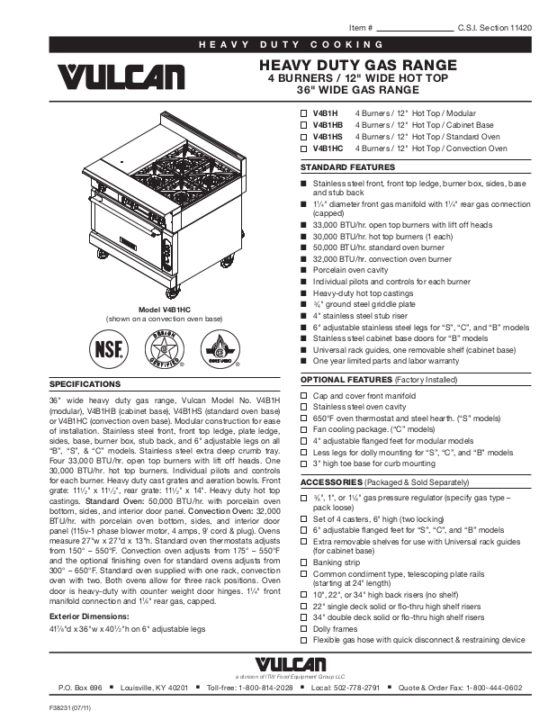 36" wide heavy duty gas range, Vulcan Model No. V4B1H