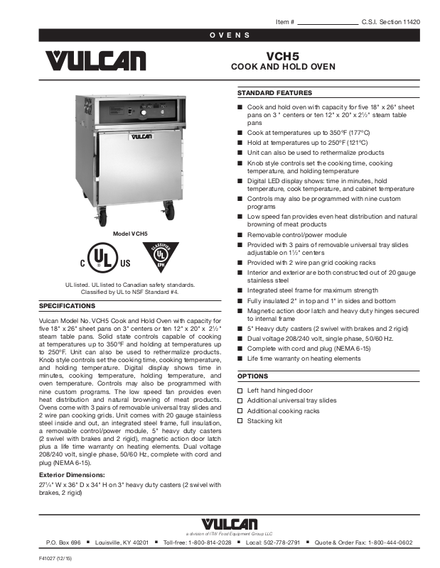 Vulcan Model No. VCH5 Cook and Hold Oven with capacity for