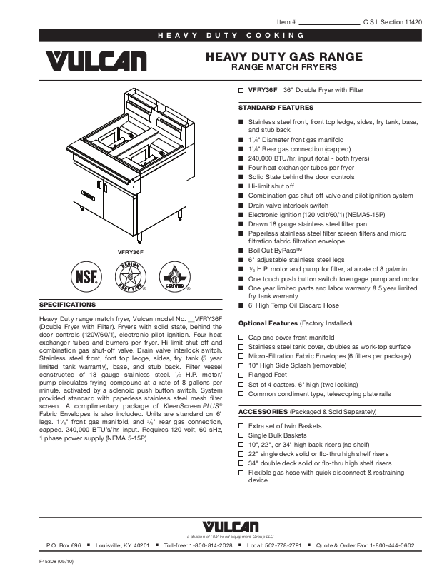 Heavy Duty range match fryer, Vulcan model No. __ VFRY36F