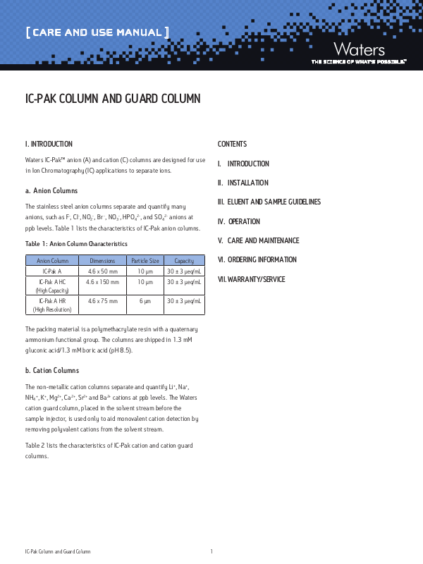ppb levels. Table 1 lists the characteristics of IC-Pak anion columns.
