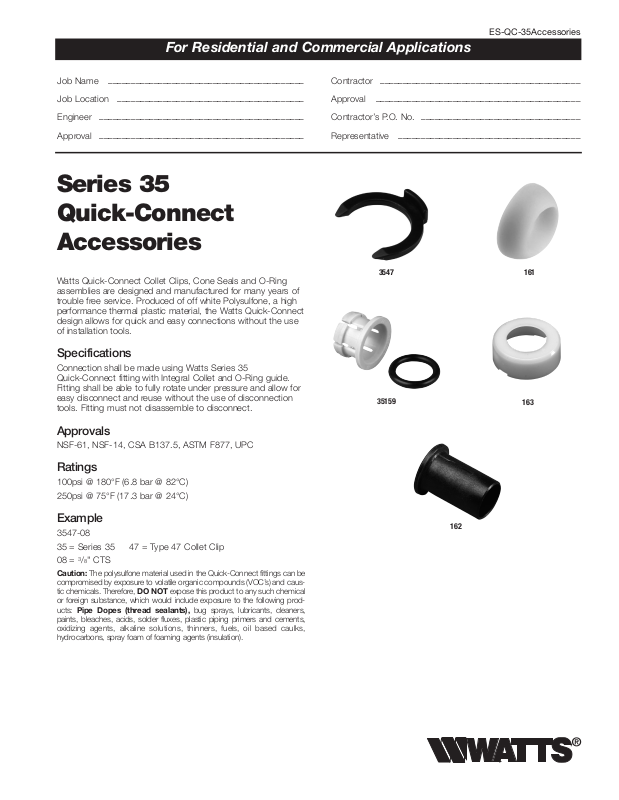 Watts Quick-Connect Collet Clips, Cone Seals and O-Ring
