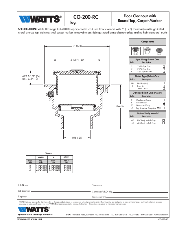 SPECIFICATION: Watts Drainage CO-200-RC epoxy coated cast iron floor cleanout with 5” (127) round adjustable gasketed
