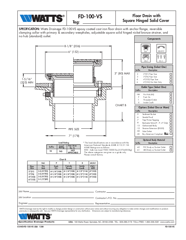 SPECIFICATION: Watts Drainage FD-100-VS epoxy coated cast iron floor drain with anchor flange, reversible