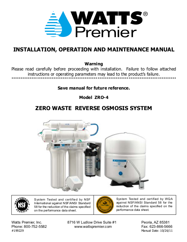 Thank you for your purchase of a Watts Zero Waste Reverse Osmosis system. With proper installation