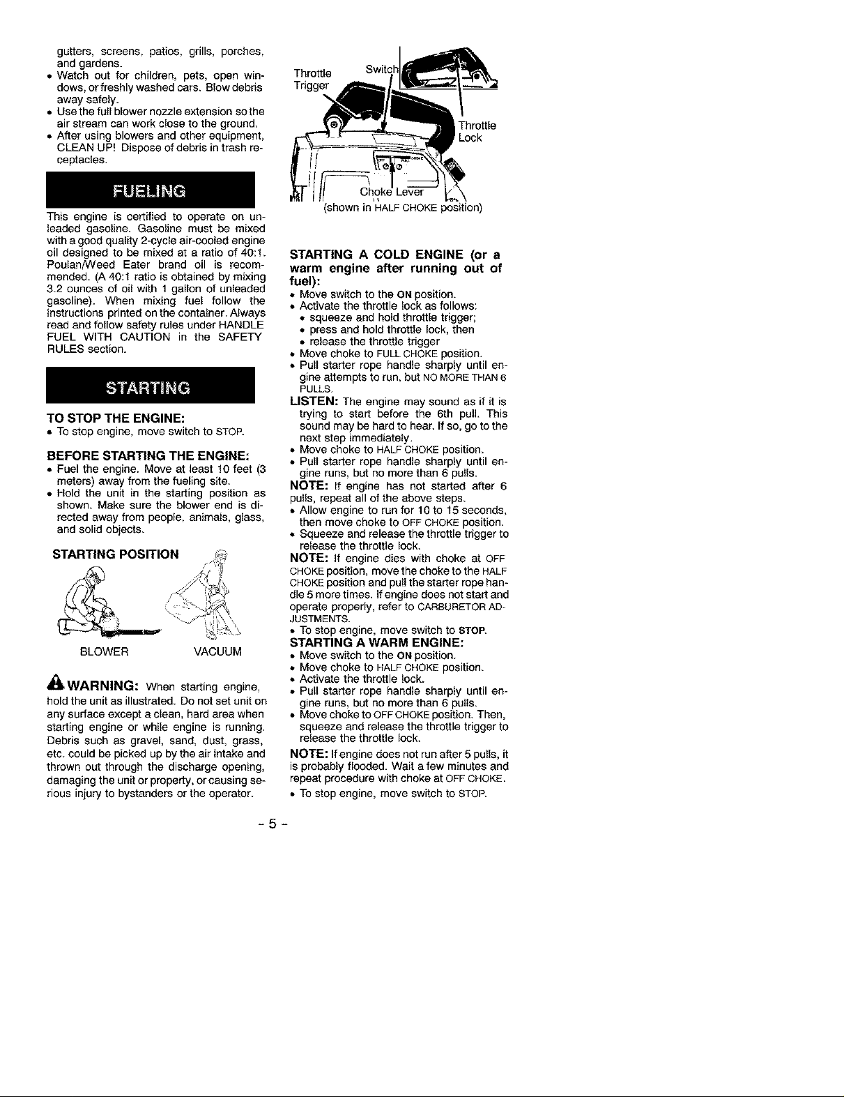 • Avoid spilling fuel or oil. Wipe up fuel spills