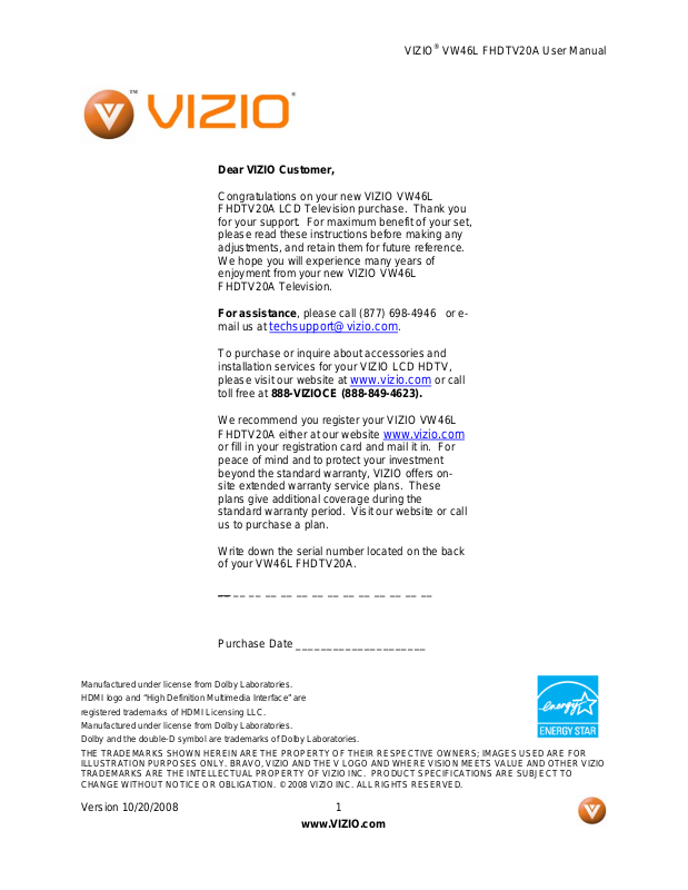 VIZIO’s Limited Product Warranty for warranty terms and conditions.