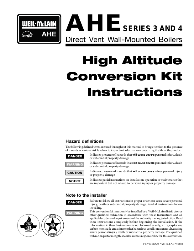 AHE Series 3 and 4 Direct V ent W all-Mounted Boilers — High Altitude Conversion Kit Instructions