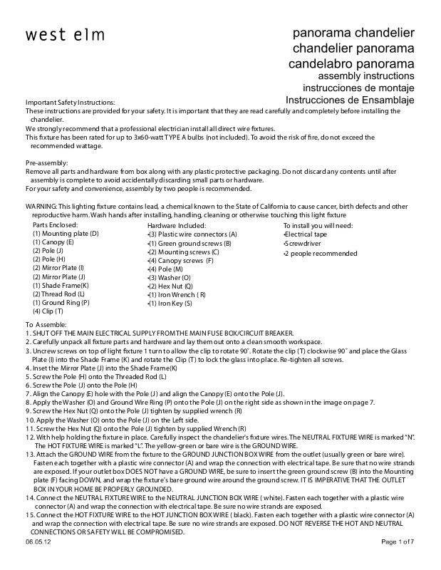 WARNING: This lighting xture contains lead, a chemical known to the State of California to cause cancer, birth defects and other