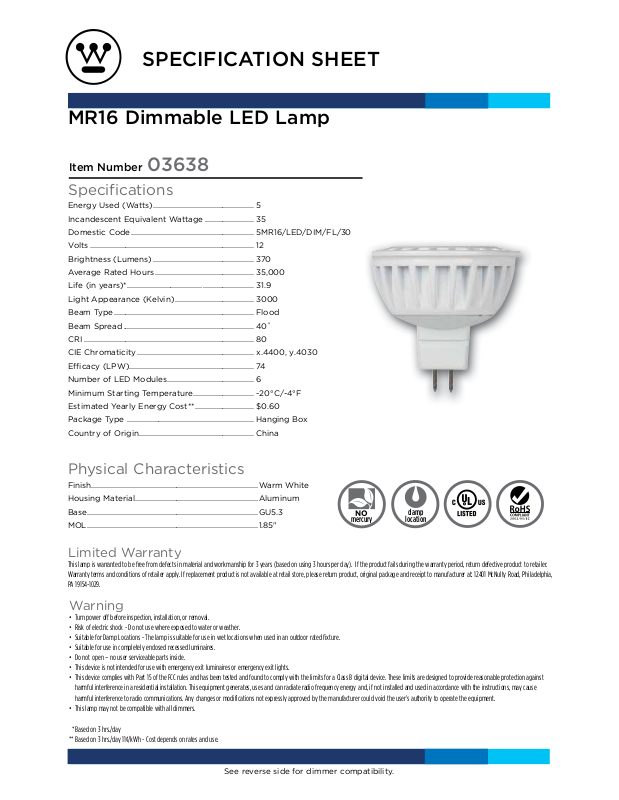 Specifications are subject to change without notice, please visit www.westinghouselighting.com for latest information.