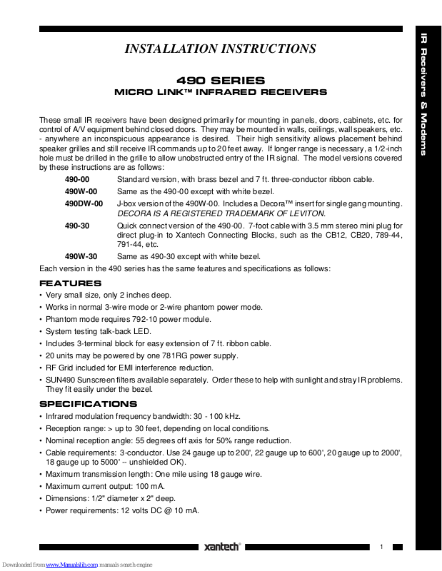 directly into the "IR RCVR" or "AUX" jack on Xantech Connecting Blocks, such as the CB12, CB20, 78944, 791-44, etc. The 490-30 should be used in installations where the connecting block is within reach of