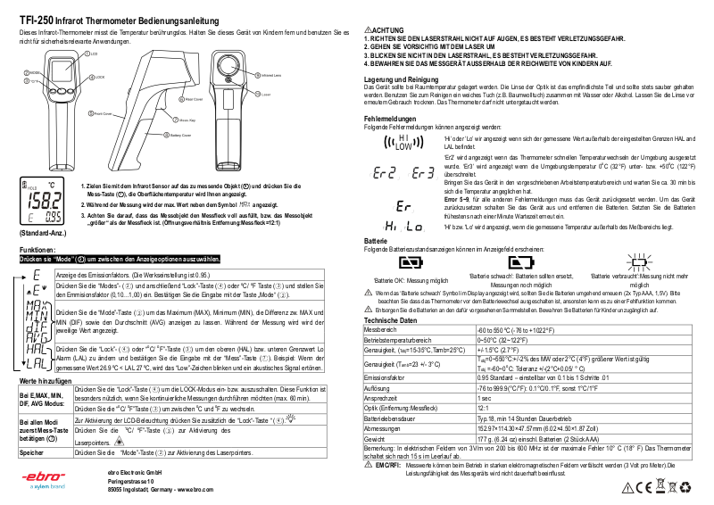 Dieses Infrarot-Thermometer misst die Temperatur berührungslos. Halten Sie dieses Gerät von Kindern fern und benutzen Sie es