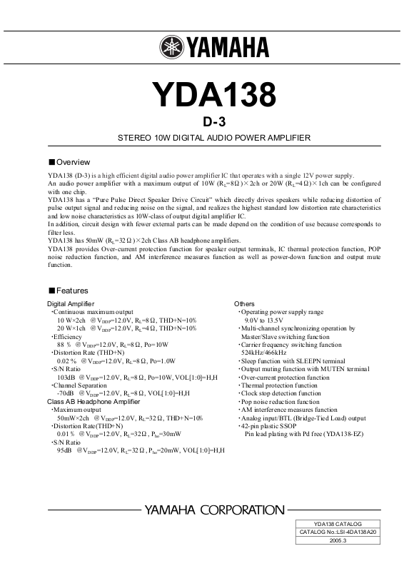 YDA138 (D-3) is a high efficient digital audio power amplifier IC that operates with a single 12V power supply.