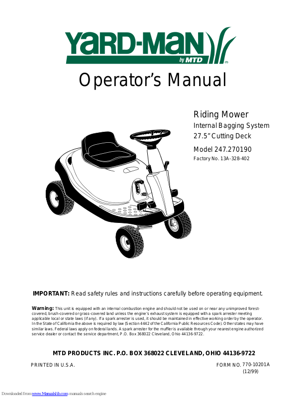 Your rider mower was built to be operated according to the rules for safe operation in this manual. As with any type