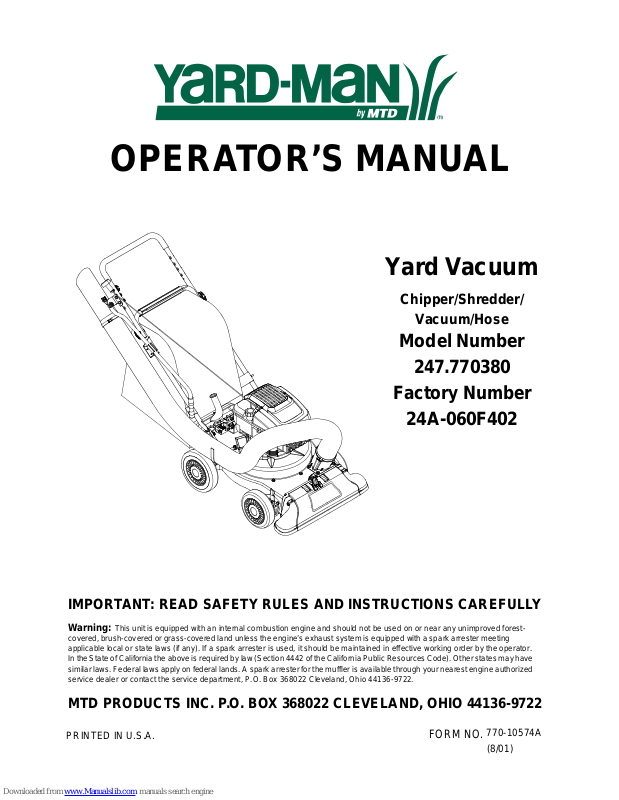 This Operator’s Manual is an important part of your new Yard Vacuum. It will help you assemble, prepare