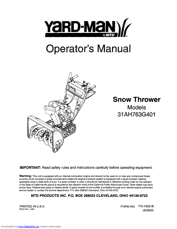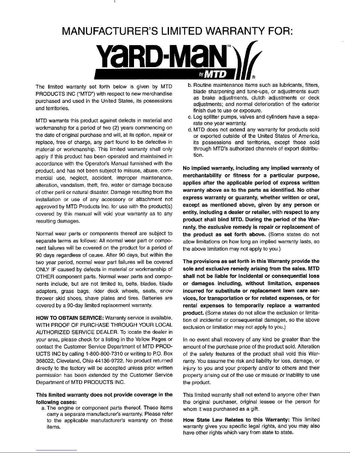 MTD warrants this product against defects in material and