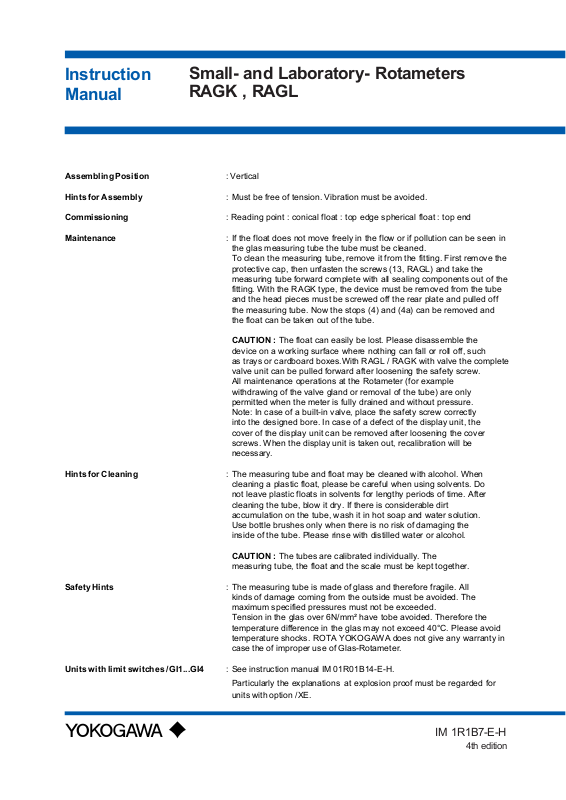 Hints for Cleaning : The measuring tube and float may be cleaned with alcohol. When