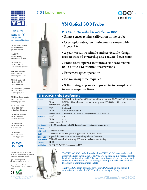 The YSI ProOBOD probe is used with the YSI ProODO handheld optical