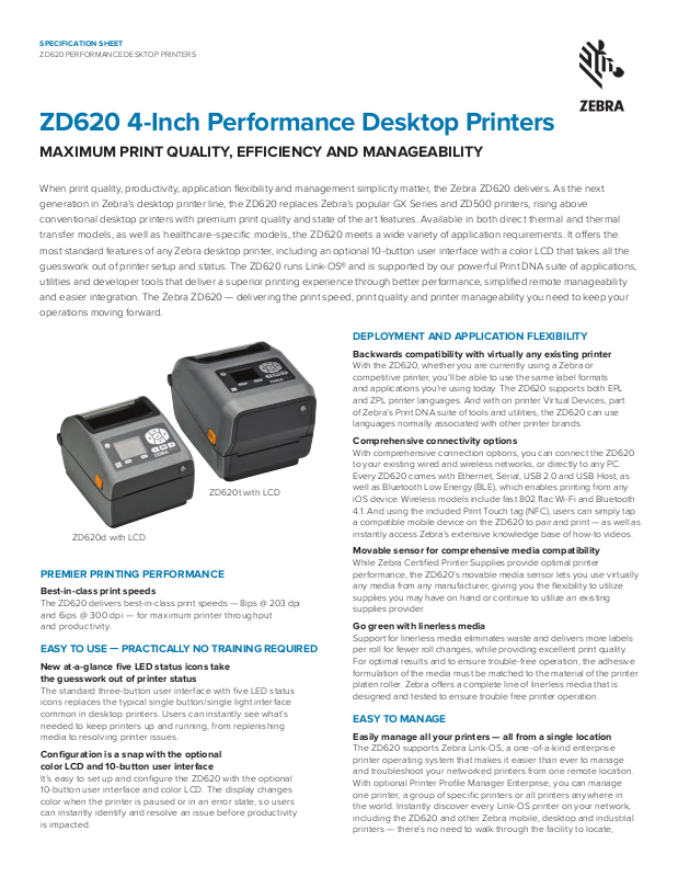 including the ZD620 and other Zebra mobile, desktop and industrial