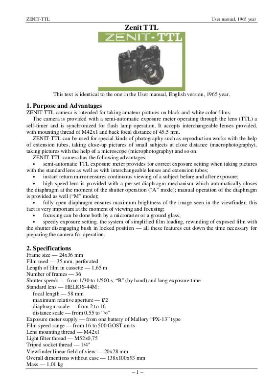 ZENIT-TTL camera is intended for taking amateur pictures on black-and-white color films.
