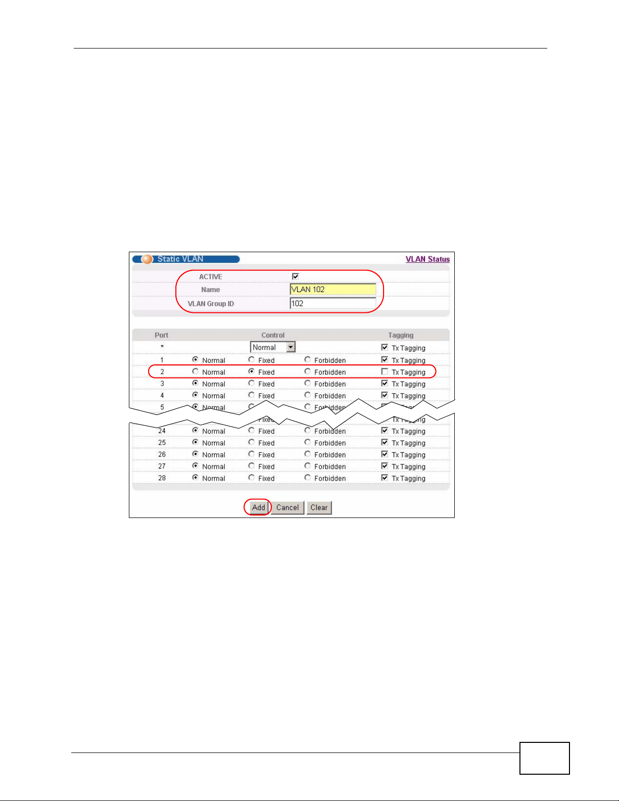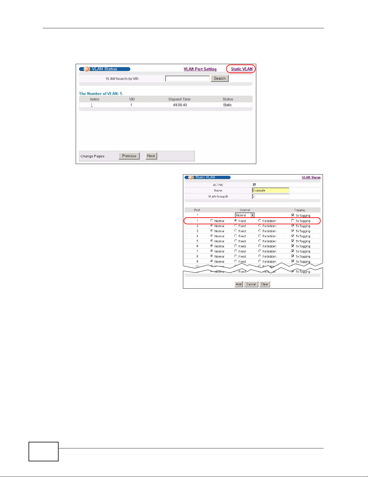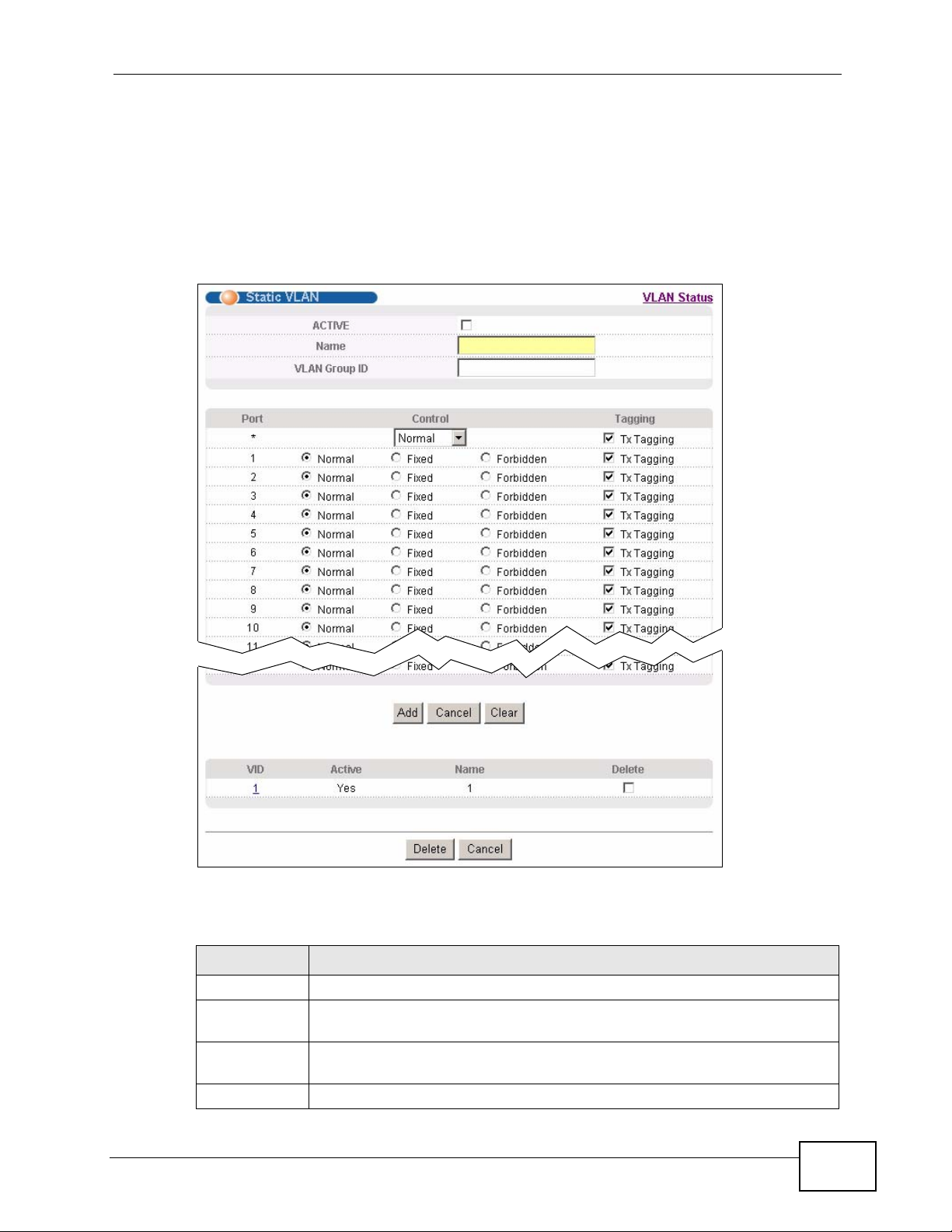 static VLAN, click Static VLAN in the VLAN Status screen to display the screen