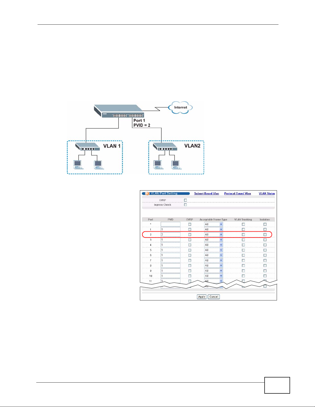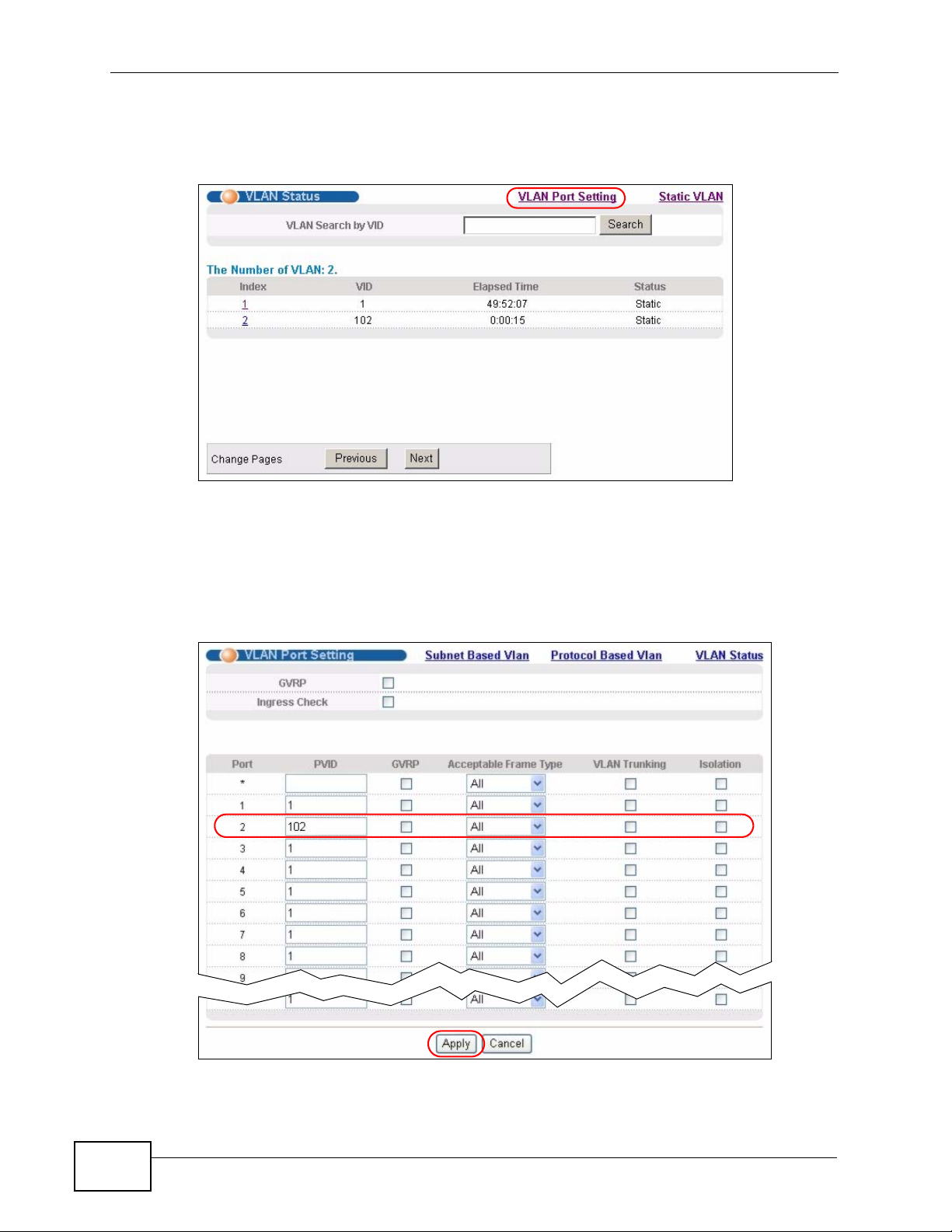VLAN. Click the VLAN Port Setting link in the VLAN Status screen.